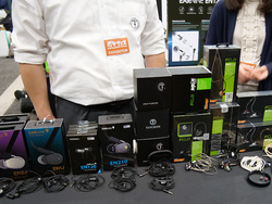 七福神商事は、本日から新たに取り扱い開始したFIDUEブランドの製品を多数展示。イヤホン4モデル/変換延長ケーブル3種/アップグレードケーブル1種がブースに所狭しと置かれていた。