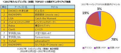 ハイレゾ音源シングル(単曲)の年間ダウンロード数TOP100内では、アニメ・声優関連のアニソン楽曲が78曲ランクイン。1位を獲得したDAOKO×米津玄師「打上花火」を始め、トップ10も8曲がアニソン関連が占める結果となった。