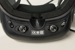 本体底面には視度調整ダイヤルを2つ搭載。左右の眼それぞれに合わせた12段階の視度調整と56〜72mmの眼幅調整が可能で、眼鏡を常用しているユーザーも裸眼で装着/使用することができる。2D/3D切り替えや、照度調整ボタンも底面に備わっている。