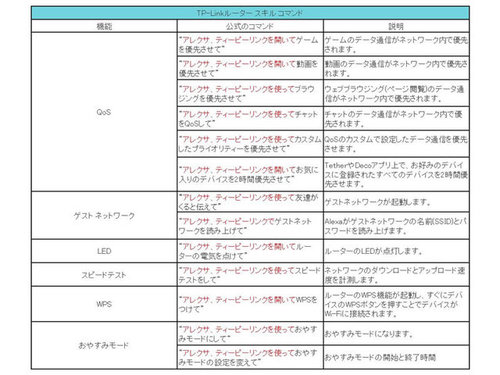 QoS、ゲストネットワーク、LEDコントロール、スピードテストの実行、WPS および おやすみモードの各機能の設定変更を音声操作で行うことが可能。上記の動画データ優先はQoS機能によるもので、ゲームの通信を優先させたり、ウェブブラウジングを優先させるなどといったこともできる。