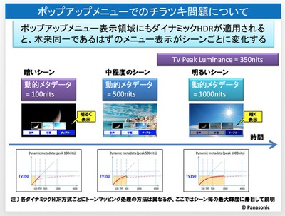 たとえばピーク輝度100nits程度の本編映像をテレビにあわせてトーンマップしたとする。その状態のままポップアップメニューを表示すると、ポップアップメニュー画面の明るい部分が白飛びしてしまうのだ。その逆のケースもあって、仮にピーク輝度1,000nitsのメタデータを使ってマッピングした場合、メニュー全体が暗くなる。