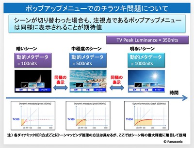 通知を受けたプレーヤー機器側は、ポップアップメニューが表示されているあいだはダイナミックHDRのメタデータを使用せず、HDR10などスタティックメタデータを利用する。これによってチラつきを抑えることができる。
