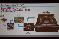 回路の構成については、デノンが1979年発売のパワーアンプ「POA-3000」から磨きあげてきた伝統のシンメトリーレイアウトを採用。電源トランスを中心として13ch分のアンプ基板およびヒートシンクを左右対称に配置する。チャンネルセパレーションの向上とクロストークの排除を徹底して、AVアンプにおいてHi-Fiクオリティーを追求している。