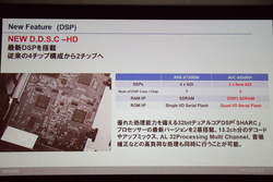 13chアンプをフル活用してのオブジェクトオーディオのデコードやアップミックス、音場補正に対応するべく、最新DSPを採用。従来は4チップ構成だったのに対して、本機はより性能を高めた32bitデュアルコアDSP「SHARC」プロセッサーの最新チップを2チップ搭載。処理速度を大幅に向上させ、高負荷処理も同時に行うことを可能にすると共に、今後のアップデートによる進化も見据えて余裕を持たせているという。