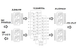 本機においてもこのJRC製チップを採用。13.2ch分のボリュームを上図のように独立させ、入力セレクターおよびアンプアサイナーも別チップとした。これにより信号経路の最適化によるロスの低減を実現。また、最新のボリューム用デバイスによってエネルギッシュかつ安定感のあるサウンドを実現したという。