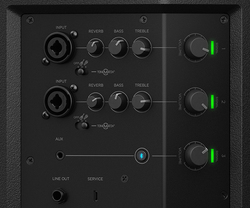 3チャンネルのミキサーを内蔵し、Ch1とCh2はXLR/標準フォーンコンボ入力を採用。リバーブ機能と音質をスイッチ一つで補正する「ToneMatch プロセッシング機能」を搭載。本機能はOFFにすることでDJやキーボードなどライン入力も可能。Ch3は3.5mmステレオミニ入力のほか、Bluetoothによるワイヤレス再生にも対応する。出力端子はライン/標準フォーンを装備する。