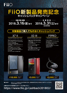 (株)エミライは、同社が取り扱うFiiOブランドのポータブルオーディオプレーヤー「X7 MarkII」、ポータブルアンプ「Q1 MarkII」、イヤホン「F9 PRO」などの国内発売を記念して、前述の製品購入者を対象とするキャッシュバックキャンペーンを開始した。