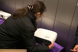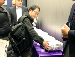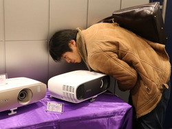 視聴会が終わると、会場後方に用意されたBenQプロジェクターの展示スペースに参加者が殺到。実際にHT2550を持ち上げて小型・軽量さを確認したり、細部をチェックするなど、映像を観ることで関心が高まった様子が見て取れた。