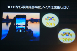 3LCD方式の採用で、明るさは全白もカラーも同じ2,000ルーメン。解像度はWXGAを確保する。また3LCD方式のプロジェクターは投写画面をカメラで撮影するときにノイズが出ないことから、SNSに映える鮮やかな写真が撮れることもアピールされている。