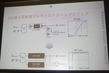 オペアンプを用いていた二世代前のAV8801と本機で、音の立ち上がり波形を比較した図も紹介。AV8801に比べて16倍のスルーレートを実現して、音の急峻な立ち上がりを再現できることも示した。