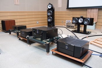 短時間ながら、試聴室にてAV8805のサウンドを確認することができた。試聴では従来モデルのAV8802との比較を実施。パワーアンプは、日本未導入の同社製7chパワーアンプ「MM8077」が2台組み合わせられた。スピーカーは、11.2ch対応のAV8802については7.1.4ch、13.2ch対応のAV8805は7.1.6chのシステムを構築(トップミドル以外は同様のスピーカーを仕様)。この2つのシステムで聴き比べを行った。なお、いずれもピュアオーディオモードでの再生で、Audysseyによる音場補正はオフで聴いた。