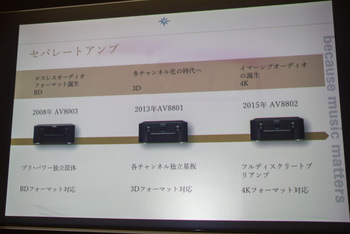 内覧会では、高山氏がマランツのAV8805に至るAVプリの系譜について紹介した。そもそもマランツのAVアンプは、1994年に登場したAVプリアンプ「AV550」から始まっており、当初から強いセパレート志向を持っていたという。
