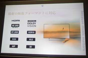 HDMI端子は8入力/3出力を搭載し、いずれもHDCP 2.2に対応。4K/60p信号のパススルーが可能で、4K/60p/4:4:4/24bit、4K/60p/4:2:0/30bit、4K/60p/4:2:2/36bitの映像フォーマットに対応する。HDR、BT.2020にも対応。HDRについてはHDR10、Dolby Vision、HLG(Hybrid Log- gamma)に対応する。