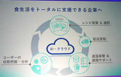 進めている取り組みについても紹介。その一つは、食の世界への新しい提案だ。「食生活をトータルに支援できる企業を目指す。キッチン家電をIoTでつなげ、ユーザーのコンディションを把握して最適なレシピを提案。食材の配送、保管、調理までをシームレスにつなぐ。全てはデータとしてクラウド上に蓄積され、ユーザーの状況に合わせて最適化される。ゆとりのない平日の献立を提案、食材は不在時でも受け渡しを可能にし、自動調理で負担を軽くする。ゆとりある休日には、こだわり料理や調理方法を提案。食材やスキルに合わせた調理方法を提案し、食を通じた非日常の体験をサポート。人に寄り添い、成長する食コンシェルジュを目指す。これを幅広いパートナーと提携し作り上げる」。