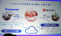 「当社は研究機関『日本睡眠化学研究所』を持ち、国立大学や大学病院とも連携して30年以上睡眠を研究している。人生100年時代のうち、30年間を睡眠や寝具に時間を割いている。これを無駄な時間ではなく、輝かしい時間に切り替えるための充電時間。効率的な睡眠をとることが課題だ。1人1人の睡眠データや環境、出来事なども関連してくる。同社は羽生結弦や大谷翔平、三浦知良らのアスリートにもノウハウを提供しており、さらに多くの人々にも提供していたい。眠る前や寝具の状況は分かるが、日中の状況や家の中の環境などは、パナソニックと共同で研究し成果を発揮していきたい」
