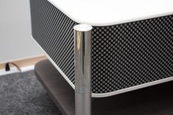 スピーカー部は2.1chで、脚部と一体化した2基の有機ELガラス管トゥイーター、正面の左右2ヶ所および背面1ヶ所に配置された合計3基の密閉型ミッドレンジ、棚板の下に別筐体として配置されたサブウーファーで構成されている。