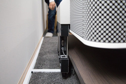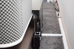 サブウーファーはバスレフ・水平対向配置型で完全に別筐体となっており、本体の底面(中段棚板の下)に配置する。