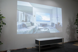 投写するのは、短焦点モデルということもあって壁面を想定しているとのこと。壁紙が貼ってある壁面よりは、壁に直に色が塗ってあることが好ましいとしている。