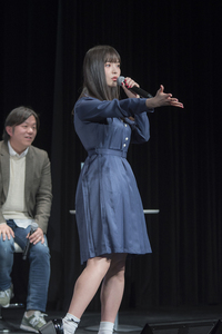 アストロガールズの第二弾PVが流され、自身が演じるキャラクターについての印象を求められた上坂さん、まずは「台本を一度も見ずに進めるんですね! 見ても良いんですよ?」と司会いじり。進行表を胸に抱いたままガチガチだった司会者はそれで緊張がほぐれたのか、その後は進行も滑らかに。ステージ慣れした上坂さんの力量と気遣いを見た。