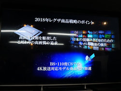 東芝映像ソリューションは、液晶・有機ELテレビ“REGZA(レグザ)”をはじめとする同社2018年度事業に関する説明会を開催。新4K8K衛星放送チューナーを2018年秋に発売することなどを明かした。価格は「5万円を切るところを目指したい」という。なお「4Kチューナー内蔵レグザの開発も進めている。一日でも早くお届け出来るようにしたい」(同社 事業部長 尾蔵氏)とも語られた。