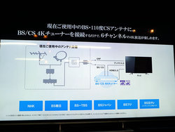 また、新4K8K衛星放送では新たに左旋波も利用するため、同放送の全チャンネルを視聴するためには左旋対応アンテナを設置する必要がある。しかし同社では「BS右旋でも新4K放送は6ch(NHK/BS朝日/BS-TBS/BSジャパン/BSフジ)開設されるため、アンテナを交換せずともチューナーさえつなげば新4K放送を視聴できる」と説明した。なお「SHマーク」がついた左旋対応アンテナを設置した際には18chの4K放送を視聴できる(前述の6社に加え/BS日テレ/東北新社メディアサービス/SCサテライト放送/QVC/WOWOW/スカパー・エンターテイメントが事業開始予定)。