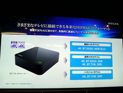 なお新4K衛星放送はHDR信号にHLG方式を採用し、本機はHDMIでテレビと接続することになるため、新4K衛星放送のHDRを本機経由で視聴するにはテレビ側のHDMI端子がHLGに対応している必要がある。「もちろん各社のテレビで本チューナーをお使いいただけるが、我々のレグザではX910/Z810X/BZ710X/M510XがすでにアップデートでHLG対応になっている」とした。