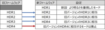 HDRに関するモードは「HDR1」「HDR2」「HDR3」「HDR4」が用意されているが、新ファームウェアでは「HDR1」がより明るさを重視したモードとして新設され、従来の「HDR1」「HDR2」「HDR3」がそれぞれ「HDR2」「HDR3」「HDR4」へと1つずつ移行。従来の「HDR4」に相当するモードは廃止となる。