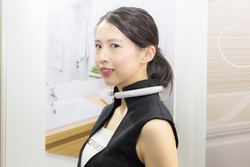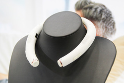 VC-NX01は“装着するスマートスピーカー”とも呼ぶべきウェアラブル端末だ。本体にセンサーが搭載されており、首元に装着するだけで電源がオンになる。音声操作のウェイクワードを発話する際にも、わざわざボタンを押してから発話する必要がなく、作業などを妨げずに利用できるとのこと。