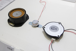 同社ブースでは、加振器ユニット「Vibtone」を使った音楽再生のソリューション提案も行われた。加振器は取り付けたもの(壁や天井など)を振動させて音を出す装置で、昨年同社がその取り組みについて発表を行っていた(関連ニュース)。