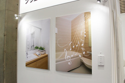 具体的な利用イメージとしては、浴室や洗面所の壁に加振器やマイクを埋め込み、あたかも壁に話しかけるようにして音声検索を行い、壁や天井が発音してのガイダンスや音楽再生ができるようになる。ブース内では実際に壁面に加振器とマイクを埋め込み、音声検索や音楽再生が行える環境を用意していた。