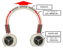 スピーカーは、ネックバンドの左右先端に配置された球体形状の中高域用スピーカーと、低音再生を担う“ベースパイプ”機能を備えたネックバンド部で構成されている。左右の球体スピーカーで発生した低音は、ベースパイプ全体を通じて伝わえられ、ネックバンドの後方部の開口部から放出される。これにより「前方のステレオ音声+後方の低音」という再生ができ、「頭を包み込むような広がりのある臨場感が体験できる」と紹介されている。