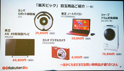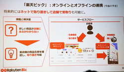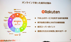 またユーザーがネット購入で重視する点として、価格のほかに、配送/安全性/商品数などがあるとし、「ビックカメラは40以上の実店舗を持っており、取り扱う商品数も多く、また高い専門性や配送網、アフターサービスが強み。楽天では70以上のネットサービスを提供し、会員IDを持つことでユーザーニーズをビックデータで所持している。それらを組み合わせ、オンラインとオフラインの連携を図ることで、ネットでの家電購入における不安点を払拭し、より便利で豊かな消費生活が提供できるとのではと考えた」と協業について説明した。