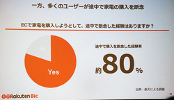 家電領域におけるネット販売事業について、楽天の矢澤氏は「家電販売事業において約30%をECサイトが占めているものの、成長率は6.3%とあまり大きくない」とし、ユーザーがECサイトからの購入を断念する理由として『実際に商品を見てみたい』『購入後の設置に不安がある』といった声があることを挙げた。