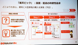 特に大型商品購入における不安点の一つとして挙げられる「設置面」に関しては、詳細案内や工事日程の申し込みなどをネット上で行えるサービスの提供を予定。「ビックカメラの店舗で行っているサービスと同様の設置・工事、アフターサービスまで含めた内容を楽天ビックでも提供していく」と説明した。配送面では、東京23区内であれば15時までの購入で即日配送するサービスも今夏に導入予定で、エリア拡大も予定しているという。