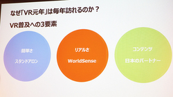 レノボジャパン(株)モバイル製品事業部・本部長の田中大輔氏は、「“VR元年”と言われているが、まだ途上段階であり成長拡大が見込める分野だと思っている。より普及するためには製品コンセプトの『簡単』『リアル』『コンテンツの拡充』がポイントだと考えている」とした。