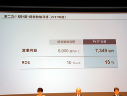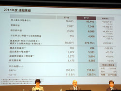 ソニーは、2017年度連結業績を発表。売上高で前年度比9,407億円(12%)増の8兆5,440億円、純損益で前年度比4,175億円増の4,908億円の純利益と大幅な増収増益となり、第二次中期経営計画で掲げた営業利益5,000億円以上、ROE10%という目標数値を超えることに成功した。