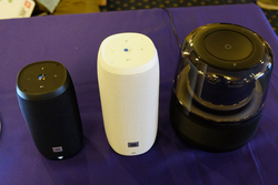 そのほか、JBLの首掛けスピーカー「SOUNDGEAR」も展示。31mm径ドライバーを4基搭載しており、首にかけるようにして使用することでBluetooth接続された音声を楽しめるウェアラブルワイヤレスデバイスだ。さらに、前日値下げが発表された(関連ニュース)スマートスピーカー「LINK 10/20」や、Harman KardonのAlexa対応スピーカー「Allure」なども展示されていた。