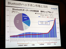なお発表会では、同社商品開発部の杉本善朗氏もあいさつ。杉本氏はBluetoothヘッドホンの国内市場について、「現在は販売程度がBluetoothになってきている」と述べ、その中でエレコムはがナンバーワンシェアを獲得していることも紹介した。