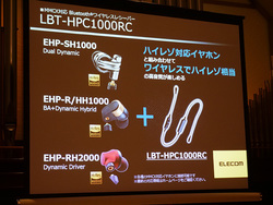 イヤホン「LBT-HPC1000」はケーブル一体型のイヤホンとなり、同社オーディオエバンジェリストの遠藤稔也氏は「このタイプとしてLDAC/aptX HDに両対応したのは、恐らく本機が初めて」と紹介する。