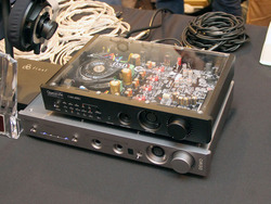 また、Questyleのブースでは、DAC/プリアンプを搭載した据置型のオールインワンヘッドホンアンプ「CMA400i」と「CMA600i」を出展。「CMA400i」はイベント展示用に天板をアクリル素材とし、内部構造が見えるような展示を行っていた。