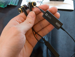 また参考出展品としてLightning - 3.5mmジャック変換ケーブルを公開した。アップル製Lightning - 3.5mm変換ケーブルのプラグ/ジャック/ケーブルをClear force Ultimateと同等のものに換装しているとのことで、音の違いや製品化の要望含め、ユーザーから意見を集めていた。