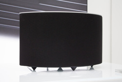 音質面については、ワンボディのオーディオシステムながら広大なサウンドステージを再現できることが特徴。これを実現するのが独特のスピーカー構成で、円弧型の本体正面にトゥイーターとミッドレンジを3基ずつ同軸構成で配置。これにサブウーファーを加えた3.1ch構成とする。本体前面の3ch分のスピーカーは、左にLch、右にRch、中央にL+Rchの信号が割り振られる。これにより広大なサウンドステージを実現すると共に、スピーカーから離れた位置でも豊かなステレオイメージが体感できるという。