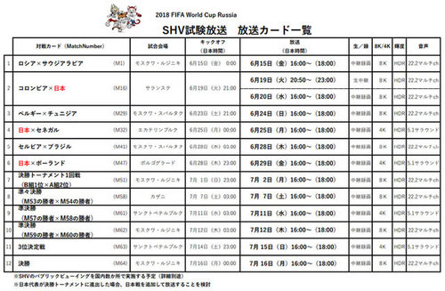 8K関連では、上記の日本対コロンビア戦をはじめ、開幕戦、決勝戦など8試合を8K/22chで制作し、8Kスーパーハイビジョンの試験放送で放送。パブリックビューイングを国内数ヶ所で実施する予定で、詳細は別途案内するとしている。また、日本代表が決勝トーナメントに進出した場合、日本戦を追加して8Kまたは4Kで放送することも検討しているという。
