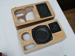 キャビネットには「このクラスで採用するのは珍しい」という木材、スピーカーユニットには57mmフルレンジユニット2基と110mmサブウーファーを採用。歪の少ないデジタル・プロセッシング・チャンネルディバイダーにより、クロスオーバー周波数を200Hzで取ることで再生音を滑らかにする。さらに重低音強化のため、背面にパッシブラジエーターも搭載している。スピーカー部の再生可能周波数帯域は50Hz〜40kHz。