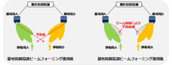 実験では、2カ所に配置した基地局が互いに協調しビーム制御を行う、基地局間協調ビームフォーミングの検証を実施。複数箇所に設置したアンテナは、その位置によっては大きな干渉が発生し通信速度が劣化するが、本実験においては、デジタル信号処理により互いの干渉を打ち消し合うビーム制御が実現した。