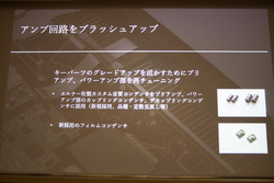 また、音質パーツのグレードアップに伴い、プリアンプ部、パワーアンプ部を再チューニング。エルナー社製のカスタム音質コンデンサーをプリアンプ/パワーアンプ部のカップリングコンデンサー、デカップリングコンデンサーに採用すると共に、品種や定数の見直しも行った。フィルムコンデンサーもこれらの変更に合わせて新規採用品が用いられた。