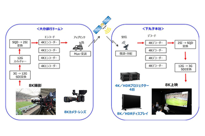 また、従来の8K映像伝送は、8K専用のエンコーダー/デコーダーを用いて圧縮信号を光専用回線などで伝送していたが、今回パートナー各社の協力の下、既存の4Kエンコーダー/デコーダー4台セットで映像の圧縮信号を衛星回線で伝送し、現行の4K機材を活用した8K映像伝送を可能にしたとのこと。これにより、今後スポーツイベントの多拠点でのパブリックビューイングなど、8K映像の利用拡大が期待されるとしている。