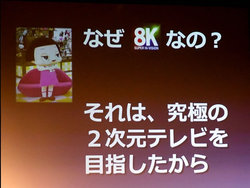 その基調講演では、高精細なため現在より大画面視聴に耐えられるだけでなく、同じ画面サイズならより近くで見ても2Kや4Kより映像の粗さが分からないこと、BT.2020による広色域、HDR、120fpsのハイフレームレートといった点も視聴者に大きなメリットをもたらすことなどを説明。