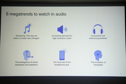 また、大島氏はオーディオ市場向けのチップセットを手がける上で、そのトレンドを知ることが重要と述べ、現在の“メガトレンド”として「ストリーミング技術」「ハイレゾオーディオ」「ワイヤレスオーディオ」「スマート機能」「3.5mmヘッドホン端子の廃止」「ヒアラブルデバイス」という6つのキーワードを挙げた。