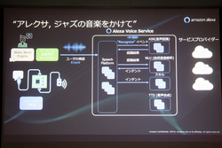 続いて、アマゾンジャパン Alexa Voice Service本部の北迫清訓氏が、同社の音声認識技術であるAlexaの特徴と戦略について紹介。Alexaはマイクとスピーカー、そしてワイヤレス技術というシンプルな要素で構成されており、音声認識をはじめとする主要な機能をクラウド側に持たせているので、ユーザーがデバイスを買い換えることなく機能の進化によるメリットを得られると、その特徴を紹介した。